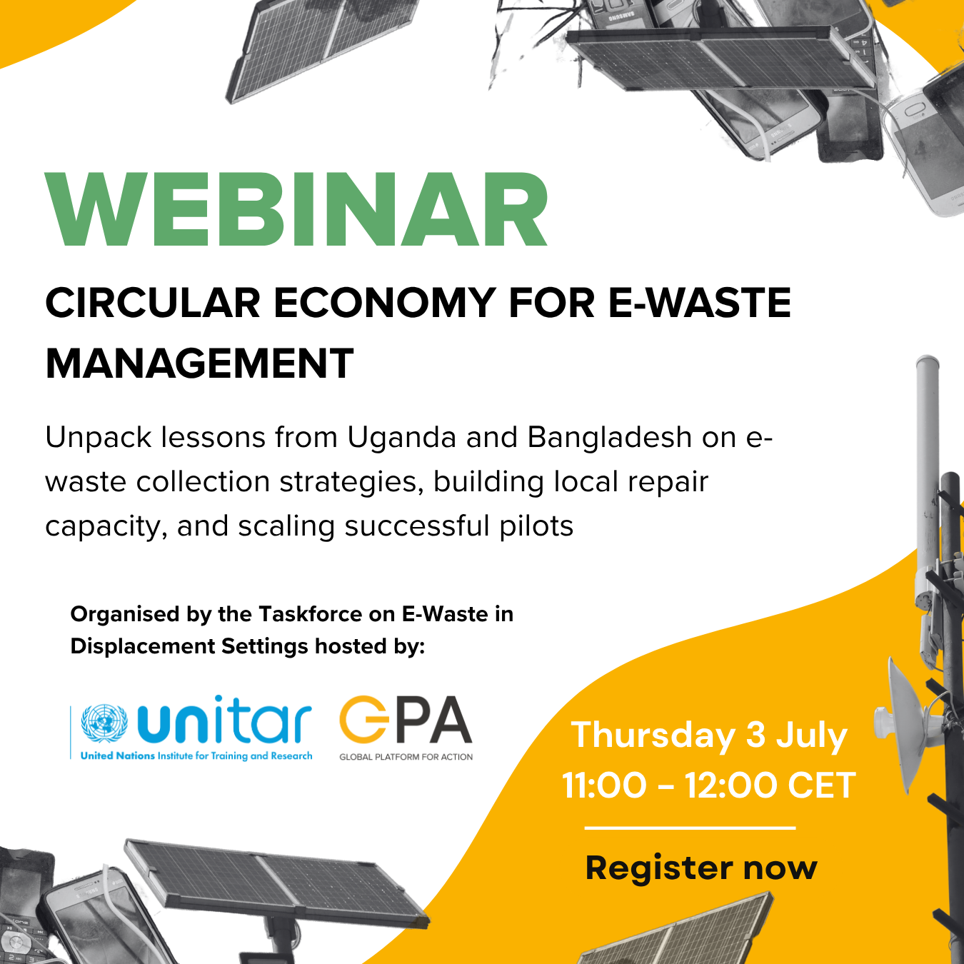 The Taskforce on E-Waste in Displacement Settings, hosted by the Global Platform for Action (GPA) on Sustainable Energy in Displacement Settings, will explore learnings and launch knowledge resources from two pilots of circular economy models to manage e-waste and create livelihood opportunities led by IOM in Uganda’s Bidi Bidi refugee settlement and UNHCR in Bangladesh’s Cox’s Bazar refugee settlement. The session will discuss how to launch e-waste initiatives, the challenges and effective approaches for building local repair capacity, and pathways for scaling e-waste management programmes in displacement settings.
