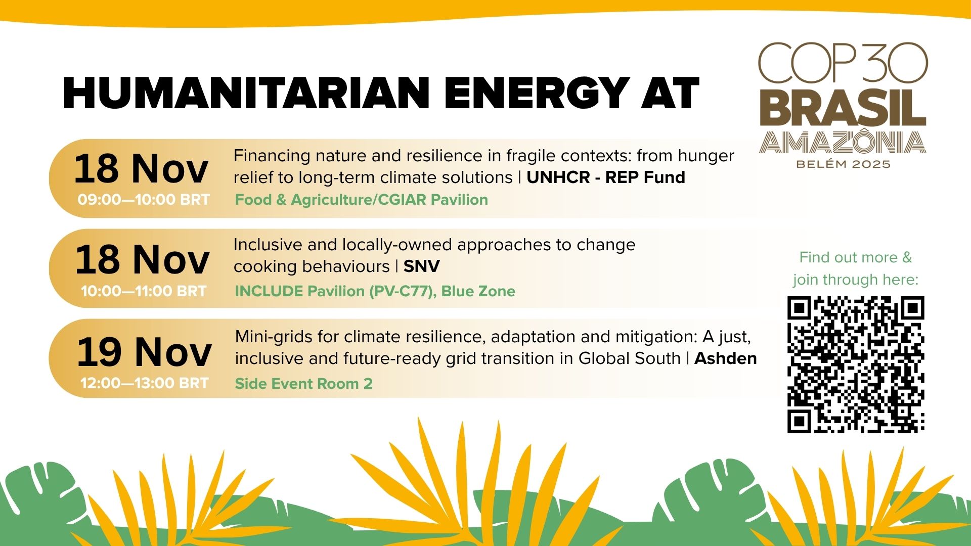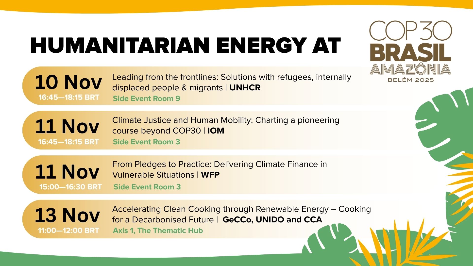 We invite all COP30 attendees and partners to join the conversations, share insights, and explore the event calendar below to see where humanitarian energy will be making an impact in Belém.