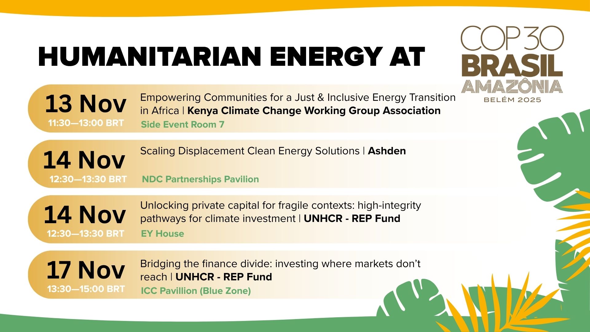 Across the two weeks of COP 30, partners will convene panels and discussions that spotlight inclusive, community-driven, and climate-smart solutions from refugee-led energy innovation to scaling finance in fragile contexts and empowering communities for a just transition in Africa and beyond.