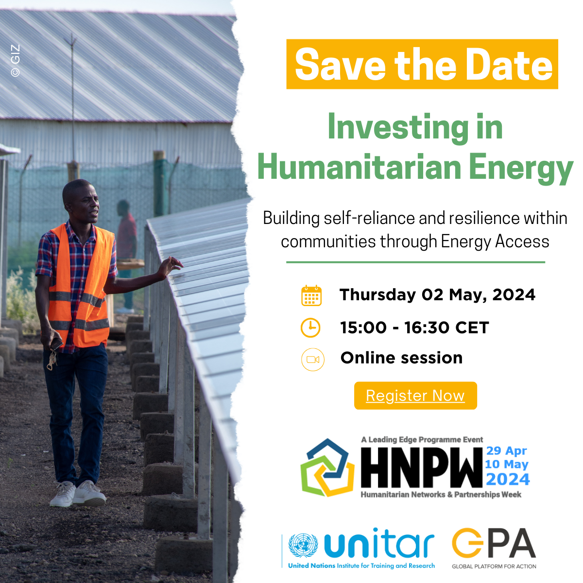 Join us in this online session: "Investing in Humanitarian Energy: Building Self-Reliance and Resilience Within Communities Through Energy Access" during the upcoming Humanitarian Networks and Partnerships Weeks (HNPW) for the GPA Coordination Unit session on May 2nd at 15:00 CET. Did you know that worldwide, 770 million people lack access to electricity and 2.5 billion people lack access to clean cooking solutions? This is a critical issue, especially for displaced populations. Currently, over 110 million forcibly displaced people worldwide lack access to sustainable energy, with the majority in camps lacking electricity and modern cooking solutions.