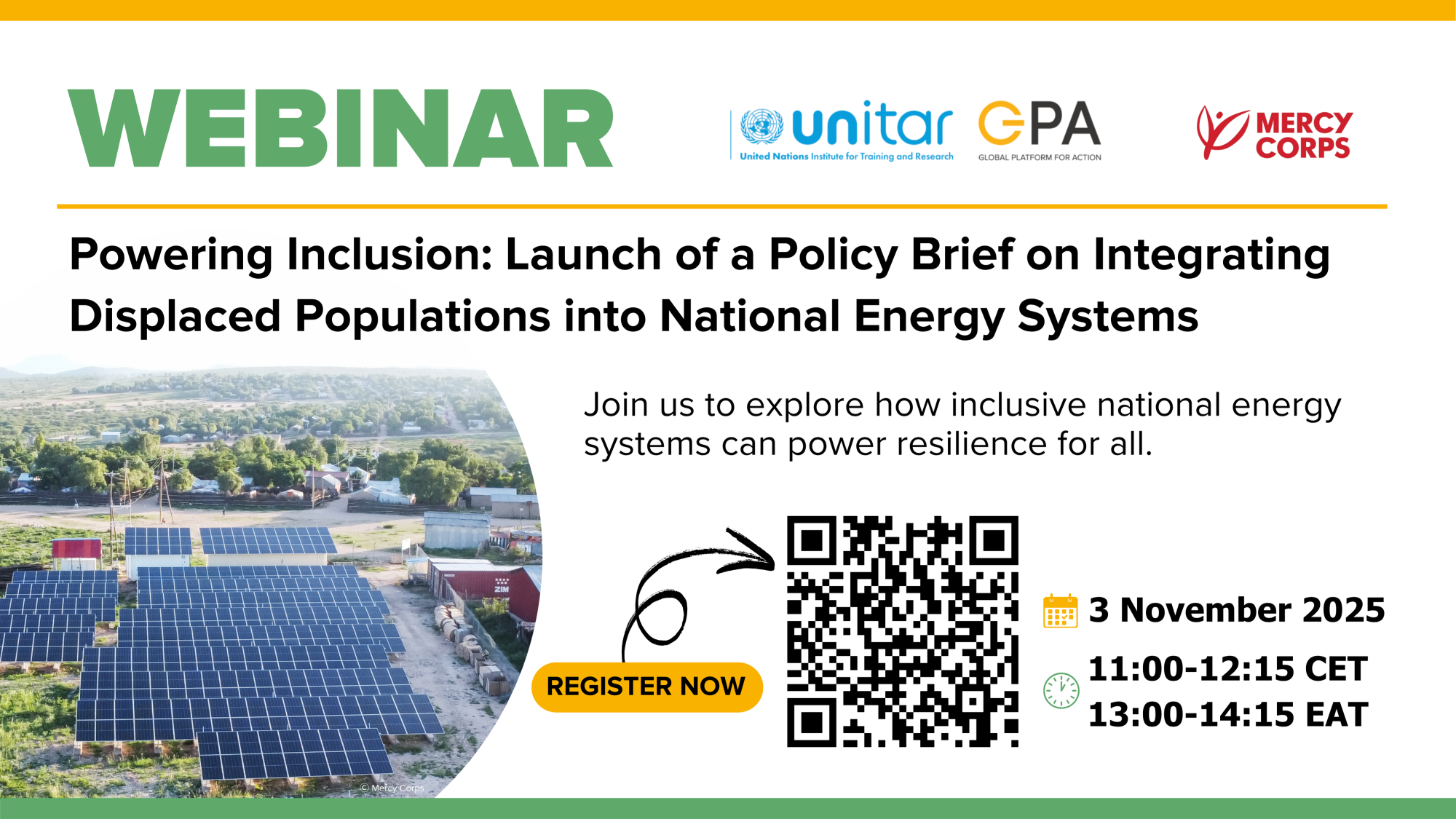 This webinar, hosted by the GPA-Mercy Corps under THEA (Transforming Humanitarian Energy Access), marks the launch of the policy brief, “Powering Inclusion: Policy and regulatory landscapes shaping energy access for displaced populations.”